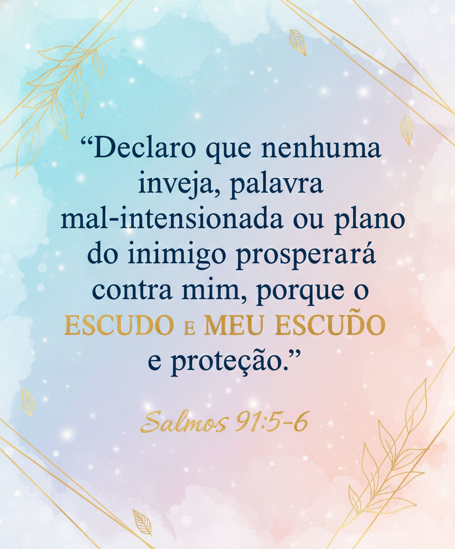 “Declaro que nenhuma inveja, palavra mal-intencionada ou plano do inimigo prosperará contra mim, porque o ESCUDO é meu escudo e proteção.”