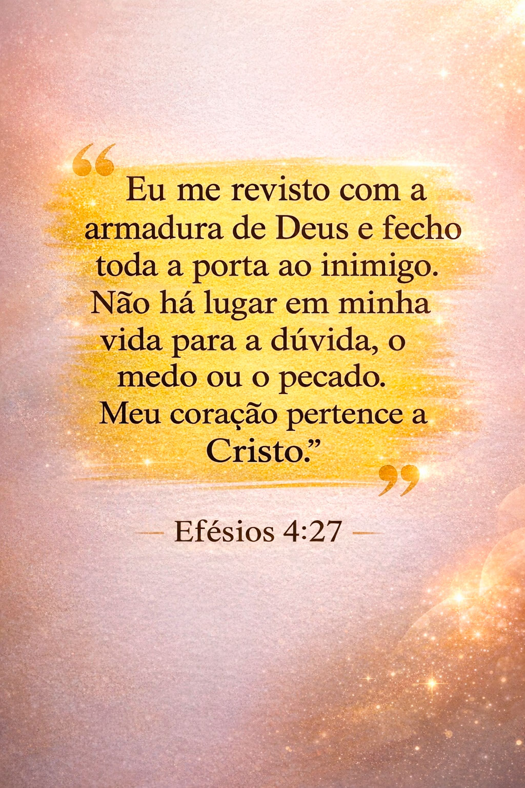Eu me revisto com a armadura de Deus https://www.mundomensagens.com.br/mensagem-biblica/eu-me-revisto-com-a-armadura-de-deus/ https://www.mundomensagens.com.br/mensagem-biblica/eu-me-revisto-com-a-armadura-de-deus/#respond Sun, 01 Feb 2026 17:41:36 +0000 https://www.mundomensagens.com.br/?p=7630 “Eu me revisto com a armadura de Deus e fecho toda a porta ao inimigo.Não há lugar em minha vida para a dúvida, o medo ou o pecado.Meu coração pertence a Cristo.” Efésios 4:27