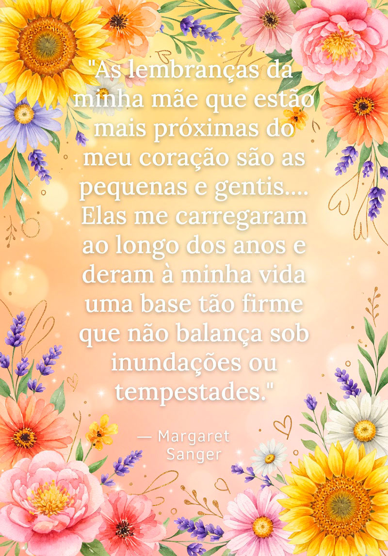 “As lembranças da minha mãe que estão mais próximas do meu coração são as pequenas e gentis…. Elas me carregaram ao longo dos anos e deram à minha vida uma base tão firme que não balança sob inundações ou tempestades.”