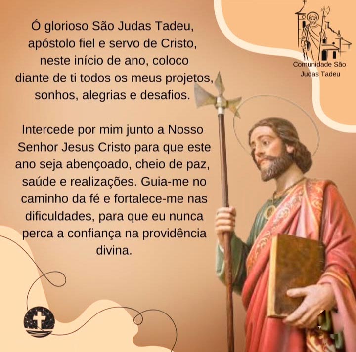 Ó Glorioso São Judas Tadeu, apóstolo fiel e servo de Cristo, neste início de ano, coloco diante de ti todos os meus projetos, sonhos, alegrias e desafios.