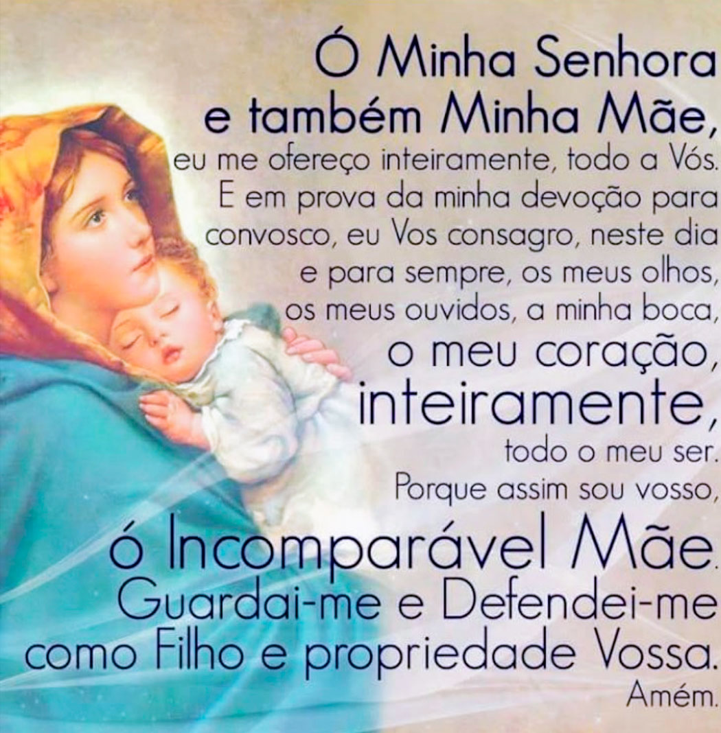 Ó Minha Senhora e também Minha Mãe, eu me ofereço inteiramente, todo a Vós. E em prova da minha devoção para convosco, eu Vos consagro, neste dia e para sempre, os meus olhos, os meus ouvidos, a minha boca, o meu coração, inteiramente,todo o meu ser. Porque assim sou vosso.