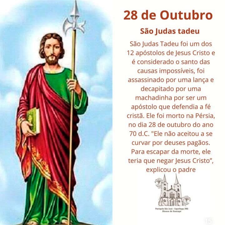 São Judas Tadeu foi um dos 12 apóstolos de Jesus Cristo e é considerado o santo das causas impossíveis, foi assassinado por uma lança e decapitado por uma machadinha por ser um apóstolo que defendia a fé cristã.