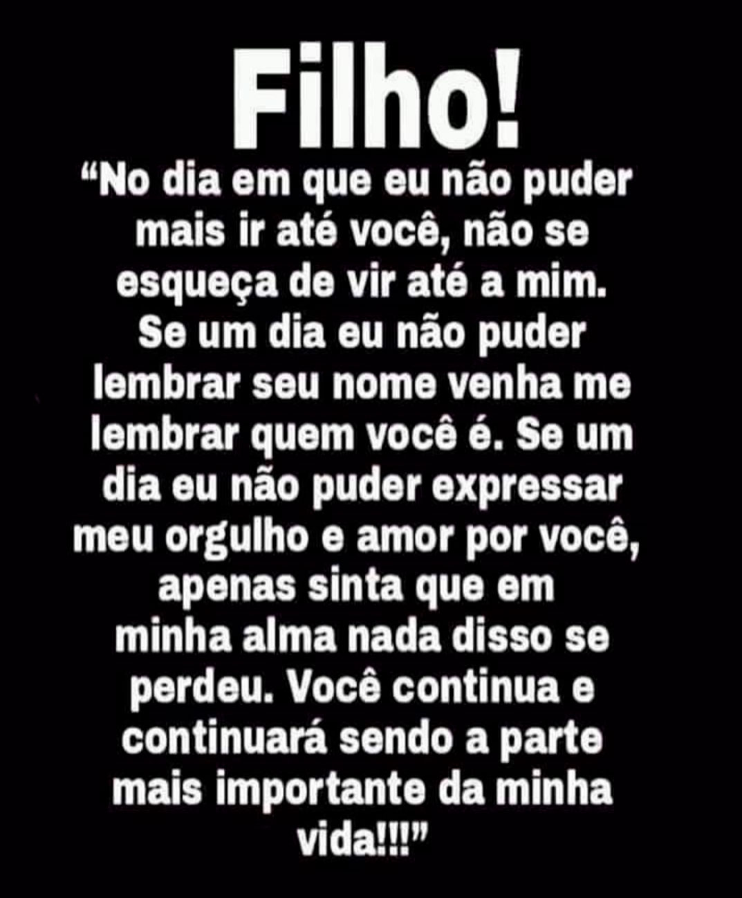 “No dia em que eu não puder mais ir até você, não se esqueça de vir até a mim. Se um dia eu não puder lembrar seu nome venha me lembrar quem você é. Se um dia eu não puder expressar meu orgulho e amor por você, apenas sinta que em minha alma nada disso se perdeu. Você continua e continuará sendo a parte mais importante da minha vida!”
