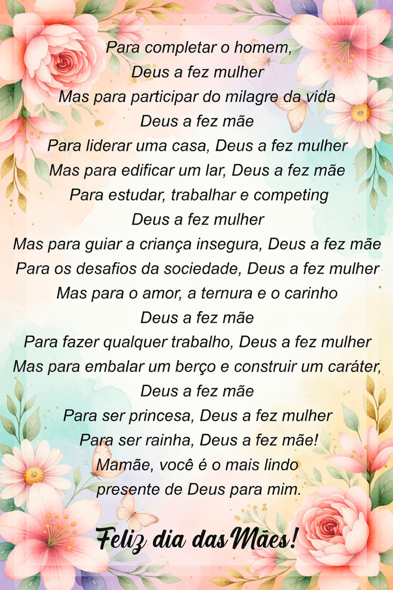 Para completar o homem, Deus a fez mulher Mas para participar do milagre da vida Deus a fez mãe Para liderar uma casa, Deus a fez mulher Mas para edificar um lar, Deus a fez mãe Para estudar, trabalhar e competir Deus a fez mulher Mas para guiar a criança insegura, Deus a fez mãe Para os desafios da sociedade, Deus a fez mulher Mas para o amor, a ternura e o carinho Deus a fez mãe Para fazer qualquer trabalho, Deus a fez mulher Mas para embalar um berço e construir um caráter, Deus a fez mãe Para ser princesa, Deus a fez mulher Para ser rainha, Deus a fez mãe! Mamãe, você é o mais lindo presente de Deus para mim.