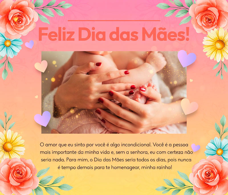 O amor que eu sinto por você é algo incondicional. Você é a pessoa mais importante da minha vida e, sem a senhora, eu com certeza não seria nada. Para mim, o Dia das Mães seria todos os dias, pois nunca é tempo demais para te homenagear, minha rainha!”