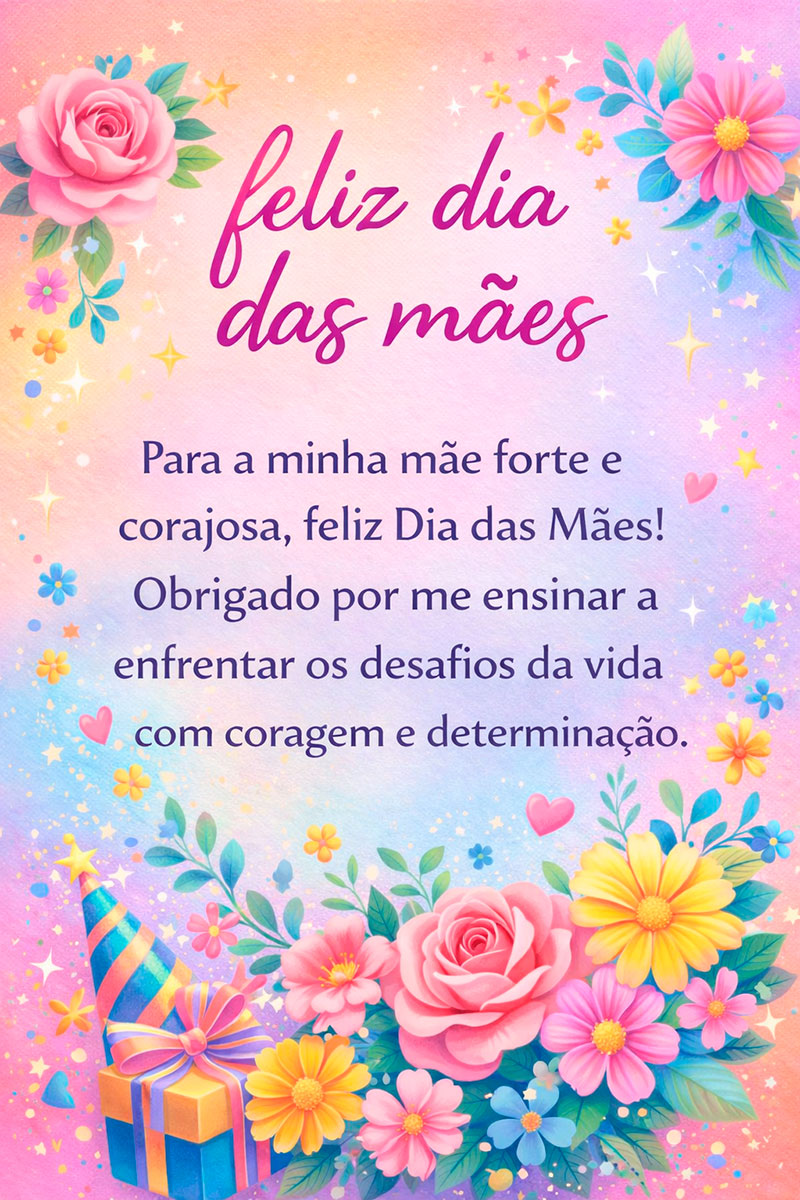 Para a minha mãe forte e corajosa, feliz Dia das Mães! Obrigado por me ensinar a enfrentar os desafios da vida com coragem e determinação.