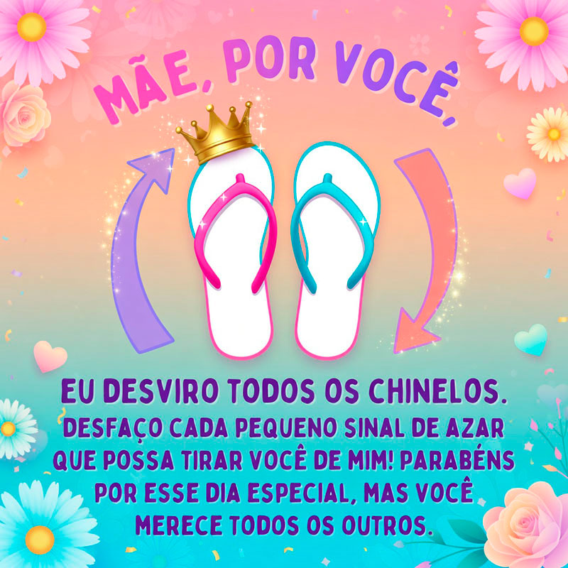 EU DESVIRO TODOS OS CHINELOS. DESFAÇO CADA PEQUENO SINAL DE AZAR QUE POSSA TIRAR VOCÊ DE MIM! PARABÉNS POR ESSE DIA ESPECIAL, MAS VOCÊ MERECE TODOS OS OUTROS.”
