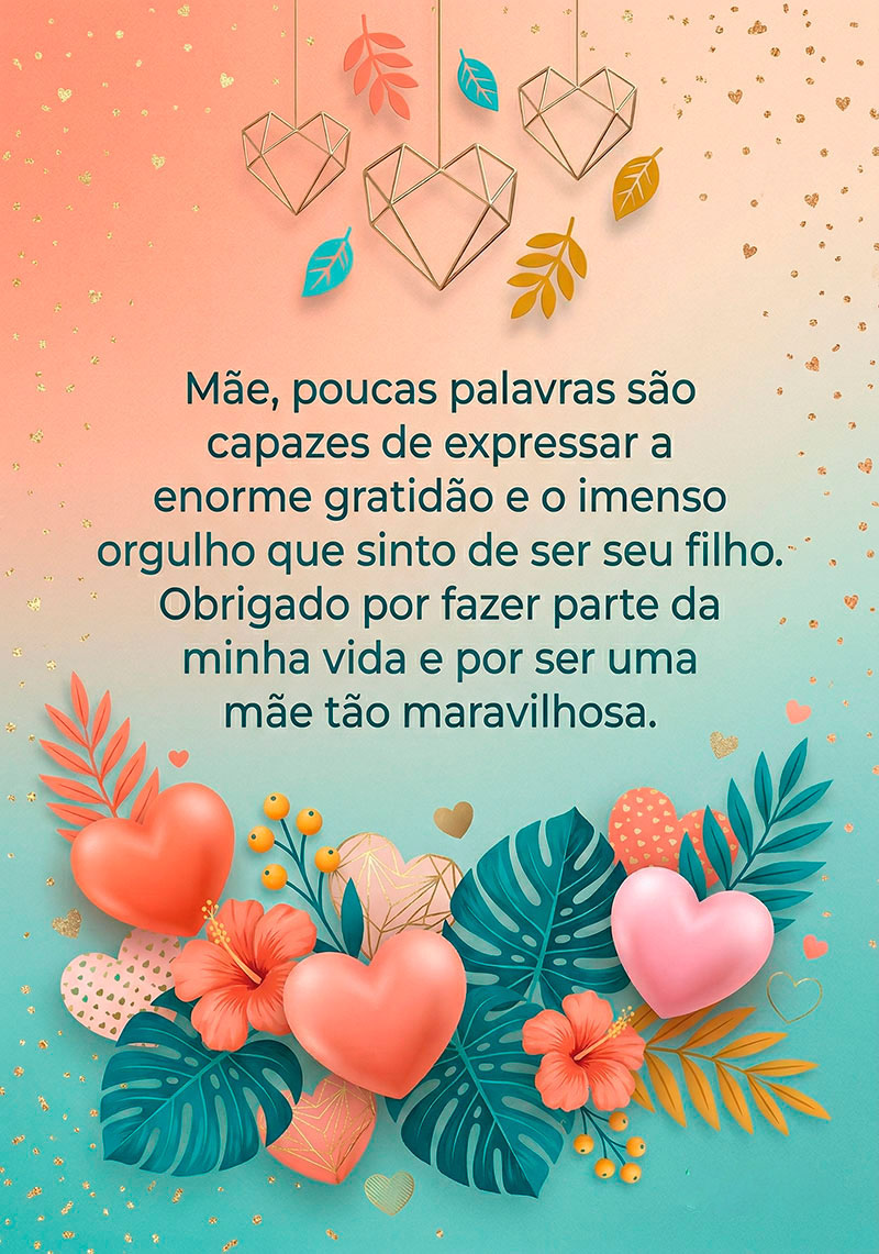 “Mãe, poucas palavras são capazes de expressar a enorme gratidão e o imenso orgulho que sinto de ser seu filho. Obrigado por fazer parte da minha vida e por ser uma mãe tão maravilhosa.”