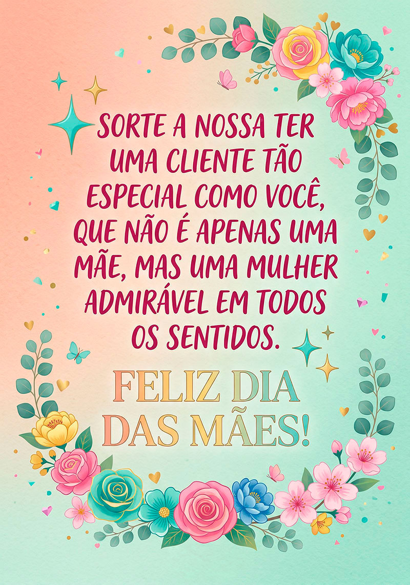 “Sorte a nossa ter uma cliente tão especial como você, que não é apenas uma mãe, mas uma mulher admirável em todos os sentidos. FELIZ DIA DAS MÃES!”