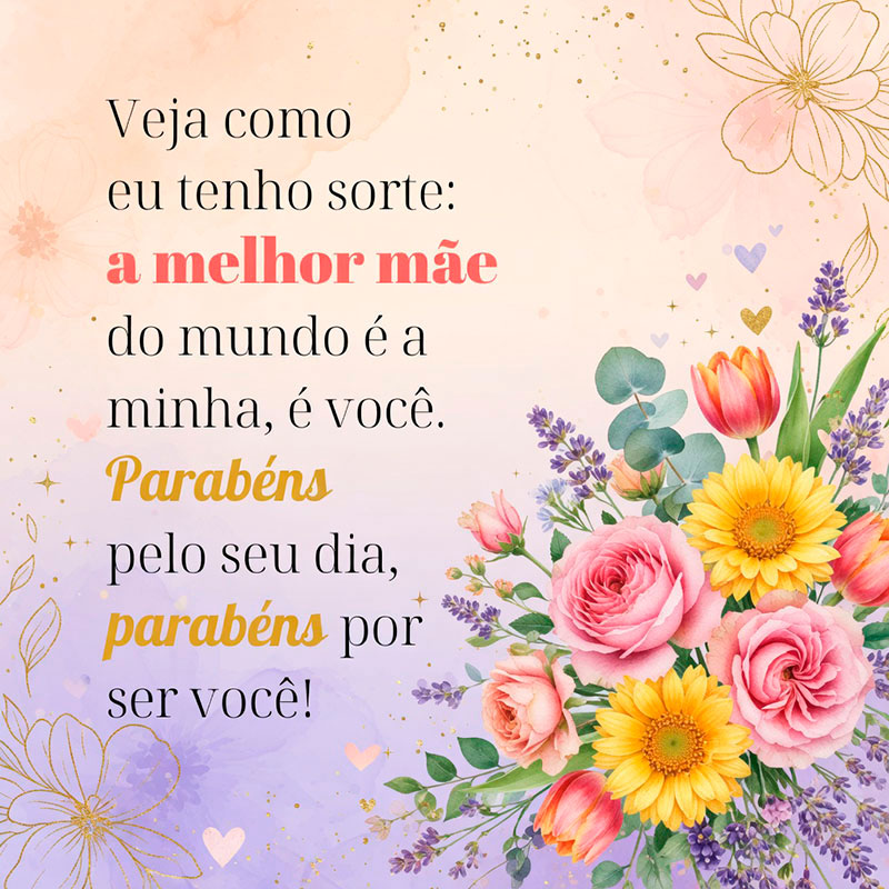 Veja como eu tenho sorte: a melhor mãe do mundo é a minha, é você. Parabéns pelo seu dia, parabéns por ser você!
