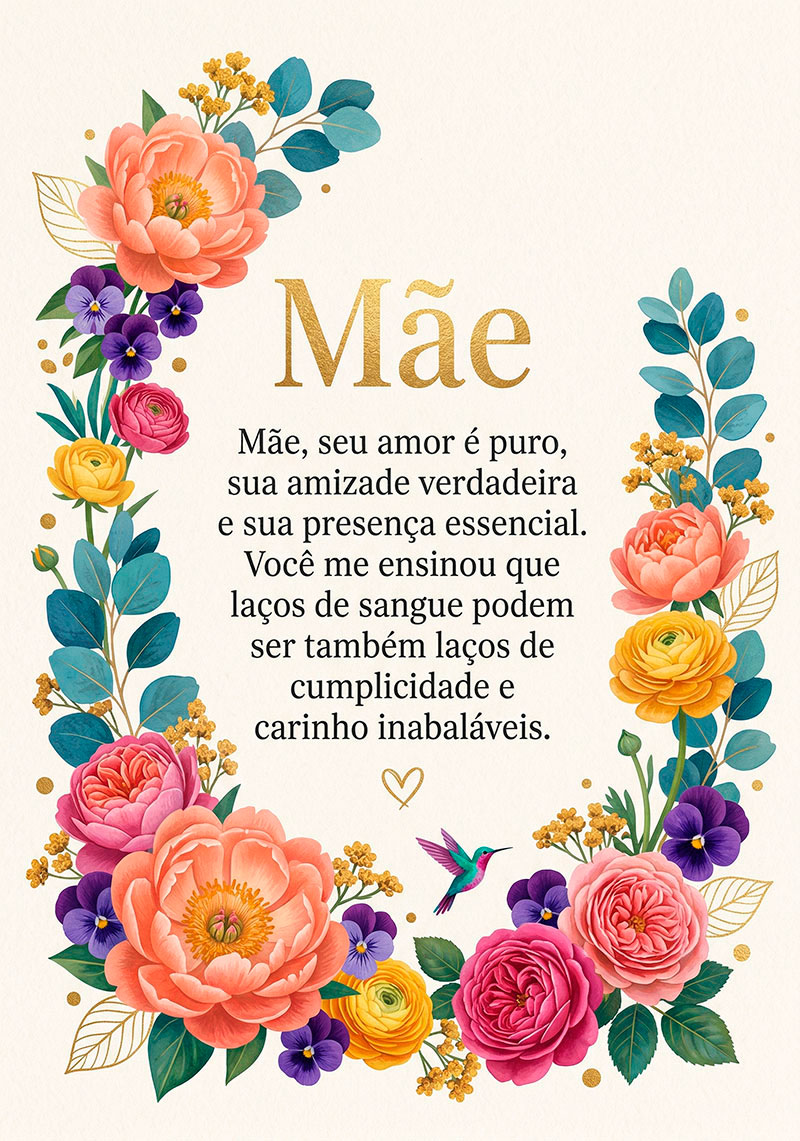 Mãe, seu amor é puro, sua amizade verdadeira e sua presença essencial. Você me ensinou que laços de sangue podem ser também laços de cumplicidade e carinho inabaláveis.