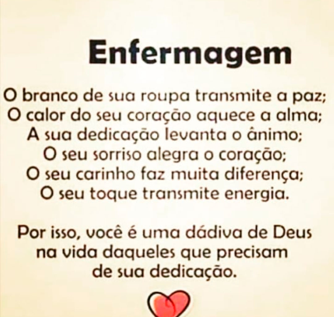 O branco de sua roupa transmite a paz; O calor do seu coração aquece a alma; A sua dedicação levanta o ânimo; O seu sorriso alegra o coração; O seu carinho faz muita diferença; O seu toque transmite energia.