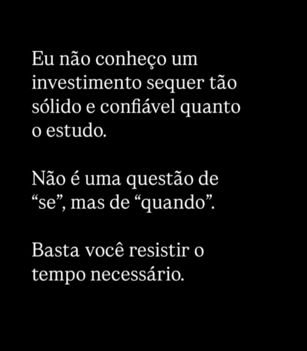 Eu não conheço um investimento sequer tão sólido e confiável quanto o estudo. Não é uma questão de ‘se’, mas de ‘quando’. Basta você resistir o tempo necessário.