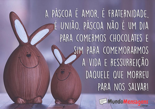 A Páscoa é amor, é fraternidade, é união. Páscoa não é um dia para comermos chocolates e sim para comemorarmos a vida e ressurreição daquele que morreu para nos salvar!