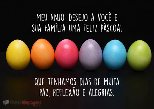 Meu anjo, desejo a você e sua família uma Feliz Páscoa! Que tenhamos dias de muita paz, reflexão e alegrias.