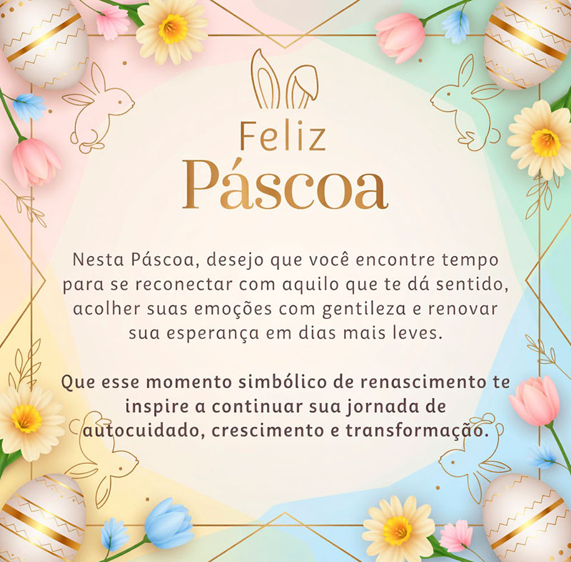 Nesta Páscoa, desejo que você encontre tempo para se reconectar com aquilo que te dá sentido, acolher suas emoções com gentileza e renovar sua esperança em dias mais leves.