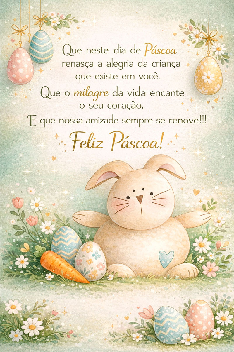 “Que neste dia de Páscoa renasça a alegria da criança que existe em você. Que o milagre da vida encante o seu coração. E que nossa amizade sempre se renove!!! Feliz Páscoa!”