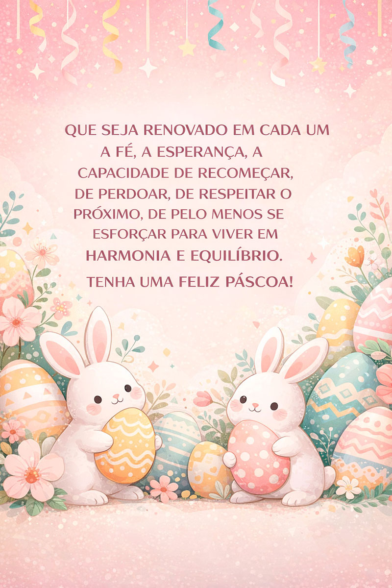 “QUE SEJA RENOVADO EM CADA UM A FÉ, A ESPERANÇA, A CAPACIDADE DE RECOMEÇAR, DE PERDOAR, DE RESPEITAR O PRÓXIMO, DE PELO MENOS SE ESFORÇAR PARA VIVER EM HARMONIA E EQUILÍBRIO. TENHA UMA FELIZ PÁSCOA!”