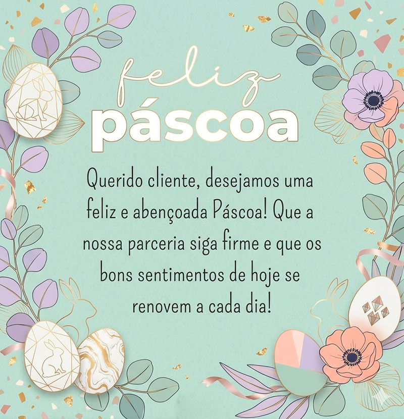 Querido cliente, desejamos uma feliz e abençoada Páscoa! Que a nossa parceria siga firme e que os bons sentimentos de hoje se renovem a cada dia!”