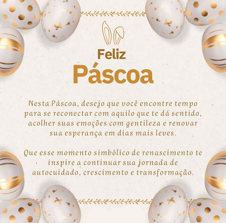 Nesta Páscoa, desejo que você encontre tempo para se reconectar com aquilo que te dá sentido, acolher suas emoções com gentileza e renovar sua esperança em dias mais leves.