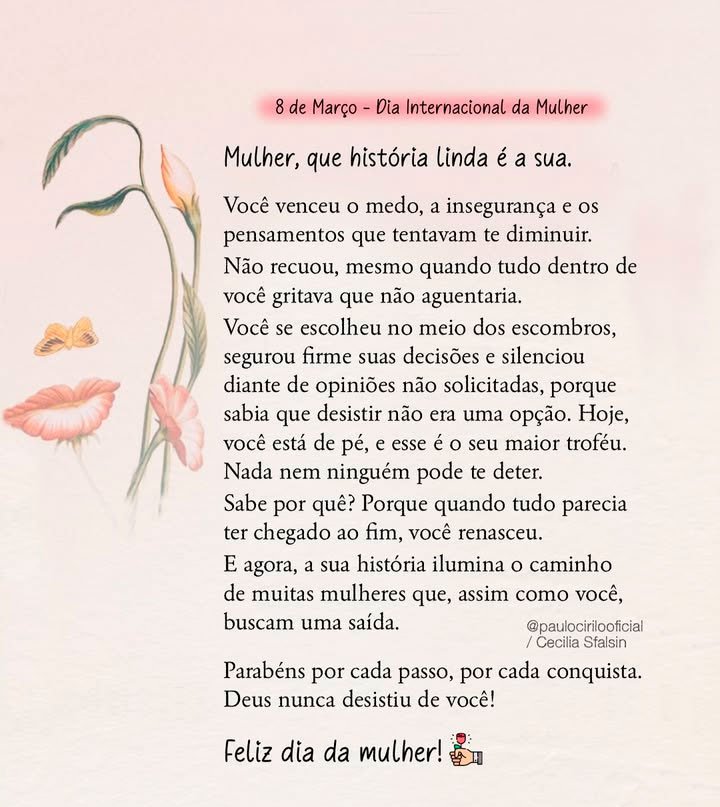 Você venceu o medo, a insegurança e os pensamentos que tentavam te diminuir. Não recuou, mesmo quando tudo dentro de você gritava que não aguentaria. Você se escolheu no meio dos escombros, segurou firme suas decisões e silenciou diante de opiniões não solicitadas, porque sabia que desistir não era uma opção. Hoje, você está de pé, e esse é o seu maior troféu. Nada nem ninguém pode te deter. Sabe por quê? Porque quando tudo parecia ter chegado ao fim, você renasceu. E agora, a sua história ilumina o caminho de muitas mulheres que, assim como você, buscam uma saída.