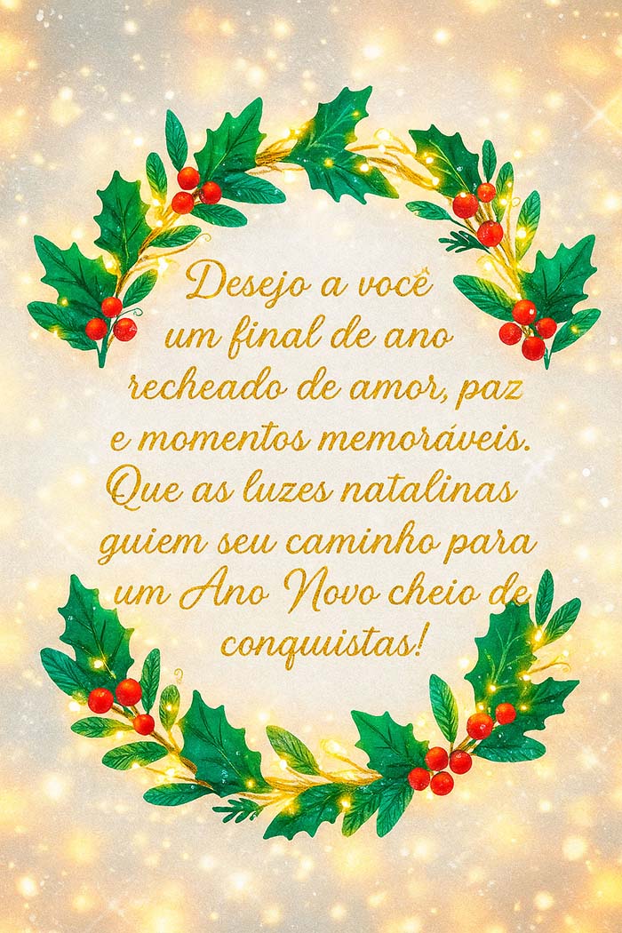 Desejo a você um final de ano recheado de amor, paz e momentos memoráveis. Que as luzes natalinas guiem seu caminho para um Ano Novo cheio de conquistas!