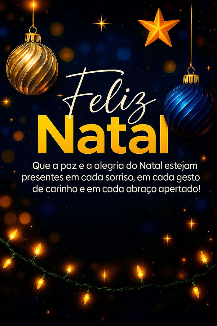 Que a paz e a alegria do Natal estejam presentes em cada sorriso, em cada gesto de carinho e em cada abraço apertado. Que este momento especial ilumine nossos corações com esperança e amor!