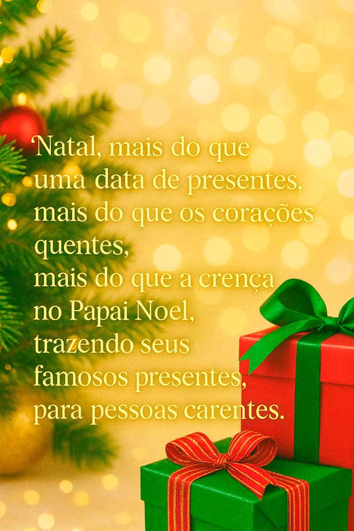 “Natal, mais do que uma data de presentes, mais do que os corações quentes, mais do que a crença no Papai Noel, trazendo seus famosos presentes, para pessoas carentes.”