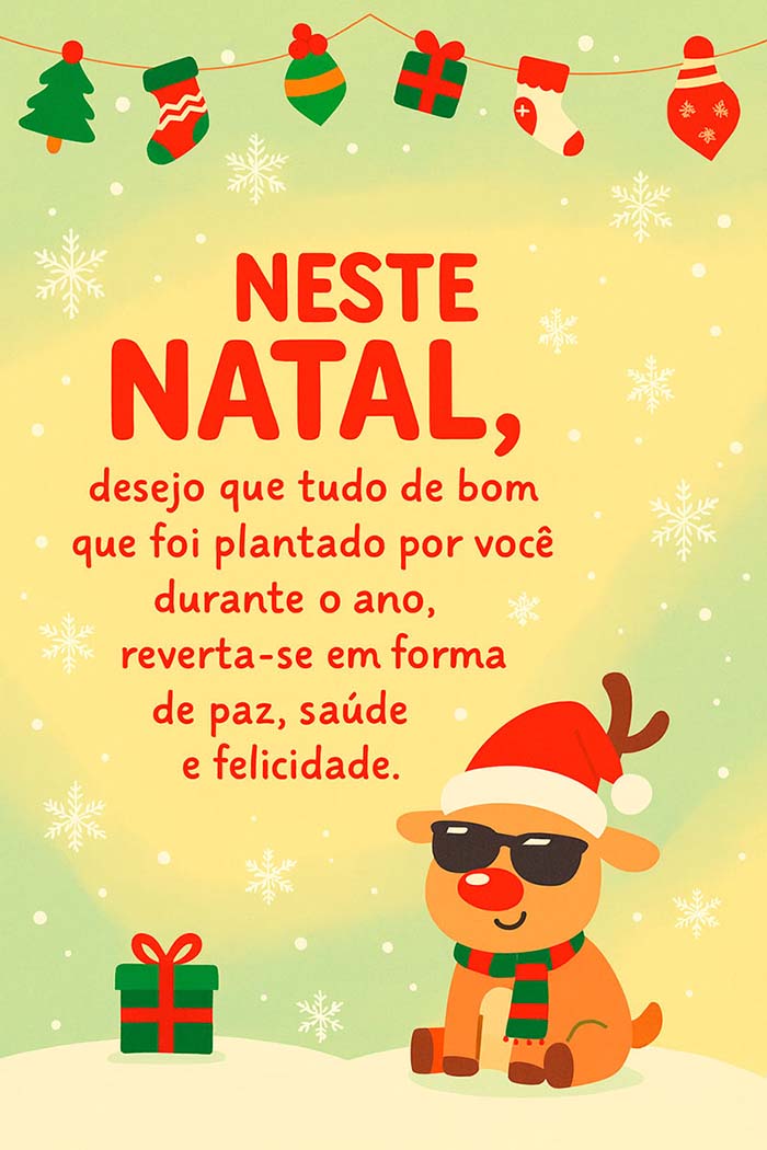 Neste Natal, desejo que tudo de bom que foi plantado por você durante o ano reverta-se em forma de paz, saúde e felicidade.