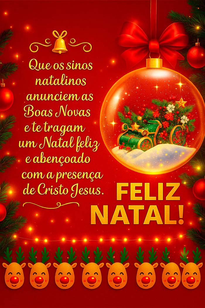 Que os sinos natalinos anunciem as boas novas e te tragam um Natal feliz e abençoado com a presença de Cristo Jesus.