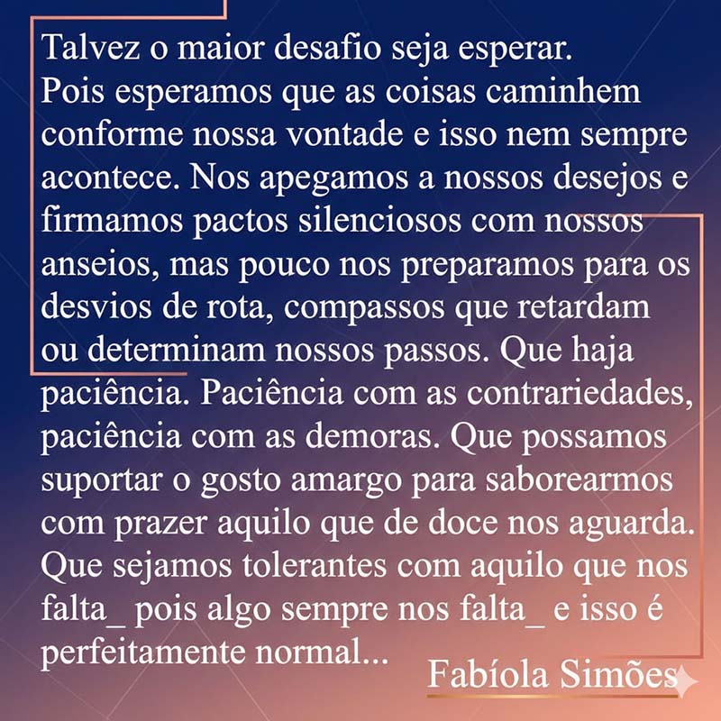 “Talvez o maior desafio seja esperar. Pois esperamos que as coisas caminhem conforme nossa vontade e isso nem sempre acontece. Nos apegamos a nossos desejos e firmamos pactos silenciosos com nossos anseios, mas pouco nos preparamos para os desvios de rota, compassos que retardam ou determinam nossos passos. Que haja paciência. Paciência com as contrariedades, paciência com as demoras. Que possamos suportar o gosto amargo para saborearmos com prazer aquilo que de doce nos aguarda. Que sejamos tolerantes com aquilo que nos falta _ pois algo sempre nos falta _ e isso é perfeitamente normal…”