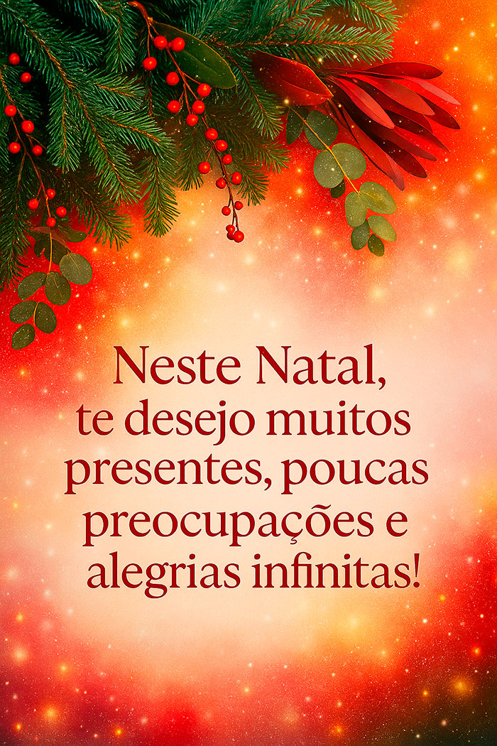Neste Natal, te desejo muitos presentes, poucas preocupações e alegrias infinitas!