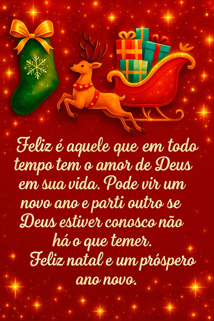 Feliz é aquele que, em todo tempo, tem o amor de Deus em sua vida. Pode vir um novo ano e partir outro; se Deus estiver conosco, não há o que temer. Feliz Natal e um próspero Ano Novo.