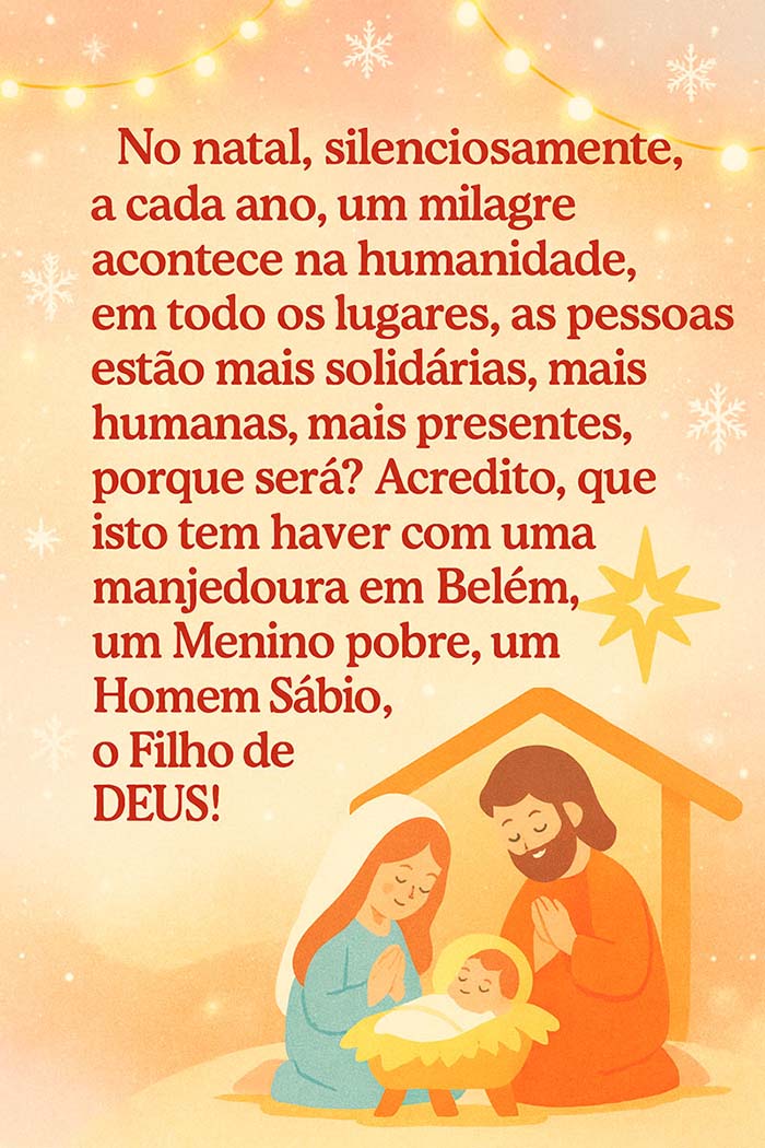 “No natal, silenciosamente, a cada ano, um milagre acontece na humanidade, em todo os lugares, as pessoas estão mais solidárias, mais humanas, mais presentes, porque será? Acredito, que isto tem haver com uma manjedoura em Belém, um Menino pobre, um Homem Sábio, o Filho de DEUS!”