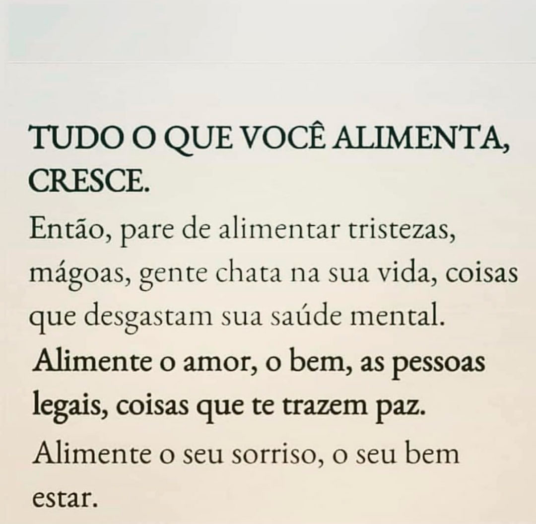 Alimente o amor, o bem, as pessoas legais, coisas que te trazem paz.