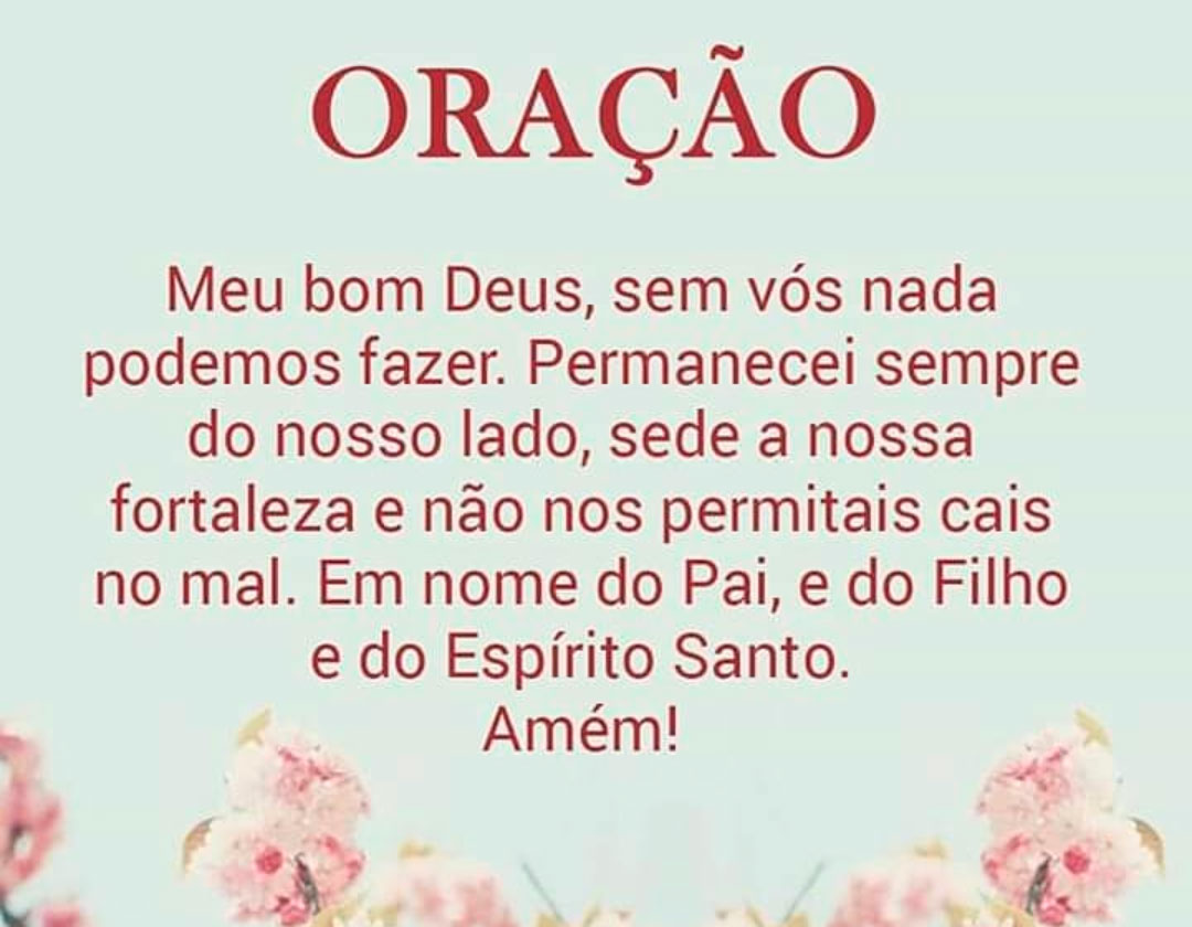 Meu bom Deus, sem vós nada podemos fazer. Permanecei sempre do nosso lado, sede a nossa fortaleza e não nos permitais cair no mal. Em nome do Pai, e do Filho e do Espírito Santo.