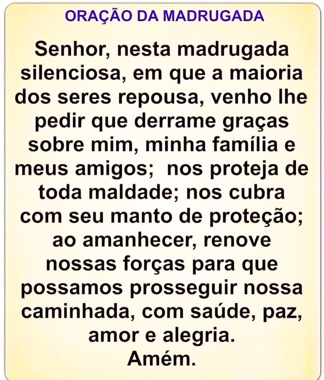 Senhor, nesta madrugada silenciosa, em que a maioria dos seres repousa, venho lhe pedir que derrame graças sobre mim, minha família e meus amigos; nos proteja de toda maldade; nos cubra com seu manto de proteção; ao amanhecer, renove nossas forças para que possamos prosseguir nossa caminhada, com saúde, paz, amor e alegria.