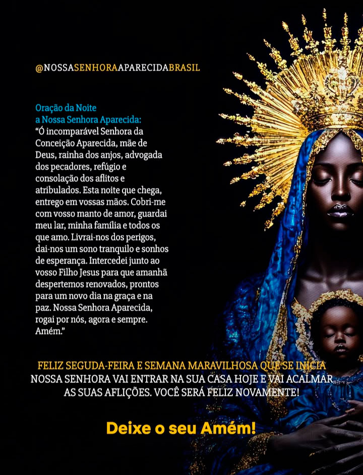 Intercedei junto ao vosso Filho Jesus para que amanhã despertemos renovados, prontos para um novo dia na graça e na paz. Nossa Senhora Aparecida, rogai por nós, agora e sempre.