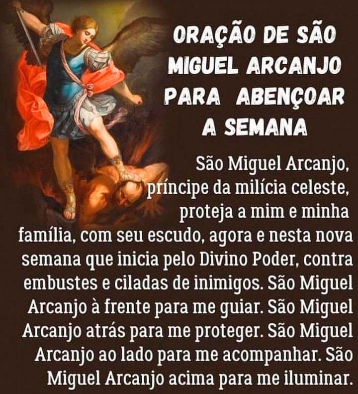 São Miguel Arcanjo, príncipe da milícia celeste, proteja a mim e minha família, com seu escudo, agora e nesta nova semana que inicia pelo Divino Poder, contra embustes e ciladas de inimigos.