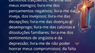 Eis me aqui, prostrado a vossos pés, ó Mãe do Céu e Senhora do Livramento. Venho louvar-nos a agradecer por todos os benefícios espirituais e temporais que Deus me tem alcançado. Iluminai a minha inteligência para eu compreender que a única felicidade na Terra é servir a Deus. Fortificai a minha vontade para que eu não deixe me deixe levar pelas tentações do mundo. Dai-me saúde e força para cumprir o meu dever. Abençoai nosso país e o povo livramentense, em particular, concedendo-lhes prosperidade e progresso. Pelo merecimento de vosso Divino Filho e pelo amor que a Ele dedicais, alcançai-me, ó mãe, essa graça. Por toda parte, cantarei vossos louvores e vosso poder, até que chegue o dia em que, levado por vós, eu entre no gozo eterno do céu.
