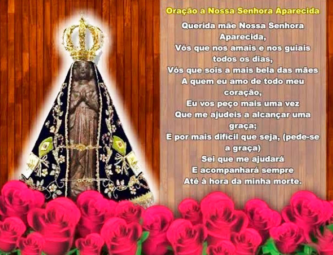 Querida Mãe, Nossa Senhora Aparecida, vós que nos guiais e nos amais todos os dias. Vós que sóis a mais bela das mães e a quem eu amo de todo meu coração, eu vos peço mais uma vez que me ajudeis a alcançar uma graça e por mais difícil que seja sei que me ajudará e acompanhará sempre até a hora da minha morte.