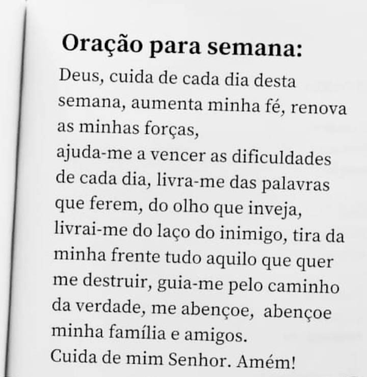 Deus, cuida de cada dia desta semana, aumenta minha fé, renova as minhas forças, ajuda-me a vencer as dificuldades de cada dia, livra-me das palavras que ferem, do olho que inveja, livrai-me do laço do inimigo, tira da minha frente tudo aquilo que quer me destruir, guia-me pelo caminho da verdade, me abençoe, abençoe minha família e amigos.