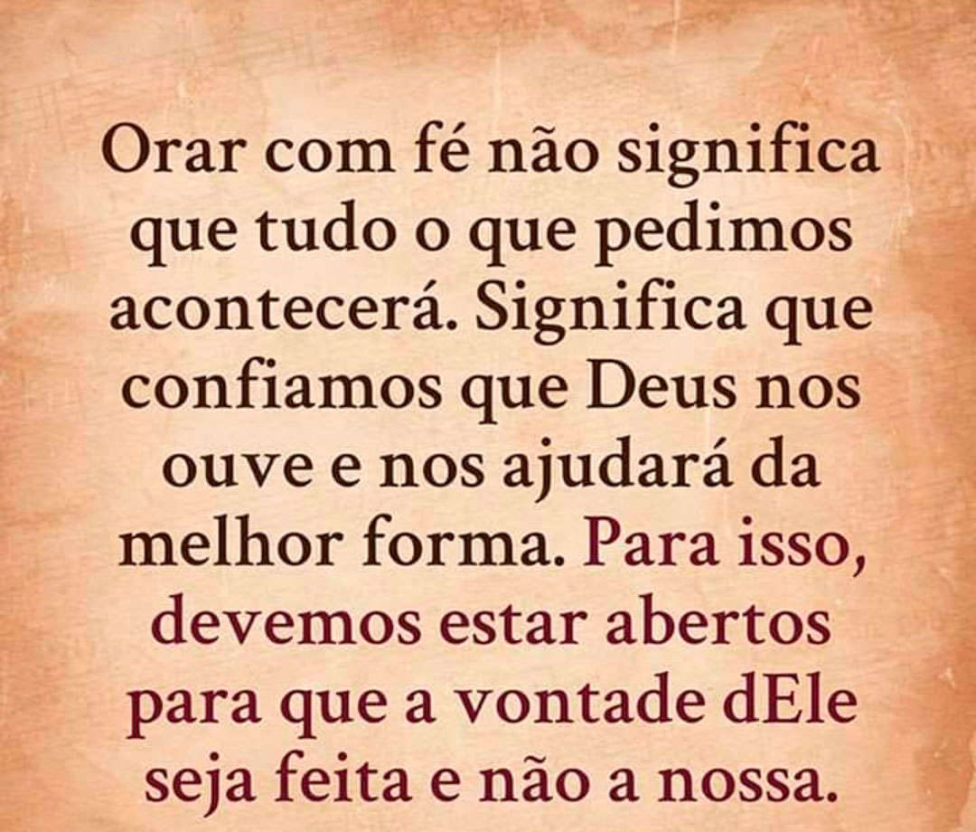 Orar com fé não significa que tudo o que pedimos acontecerá. Significa que confiamos que Deus nos ouve e nos ajudará da melhor forma. Para isso, devemos estar abertos para que a vontade dEle seja feita e não a nossa.