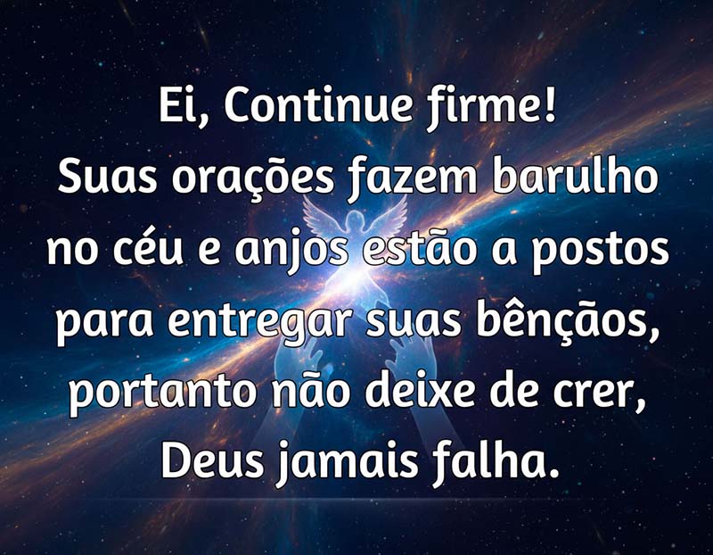 Ei, Continue firme! Suas orações fazem barulho no céu e anjos estão a postos para entregar suas bênçãos, portanto não deixe de crer, Deus jamais falha.