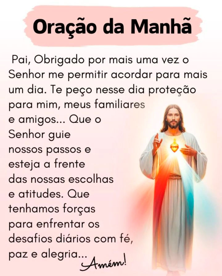 Pai, obrigado por mais uma vez o Senhor me permitir acordar para mais um dia. Te peço nesse dia proteção para mim, meus familiares e amigos. Que o Senhor guie nossos passos e esteja à frente das nossas escolhas e atitudes. Que tenhamos forças para enfrentar os desafios diários com fé, paz e alegria.