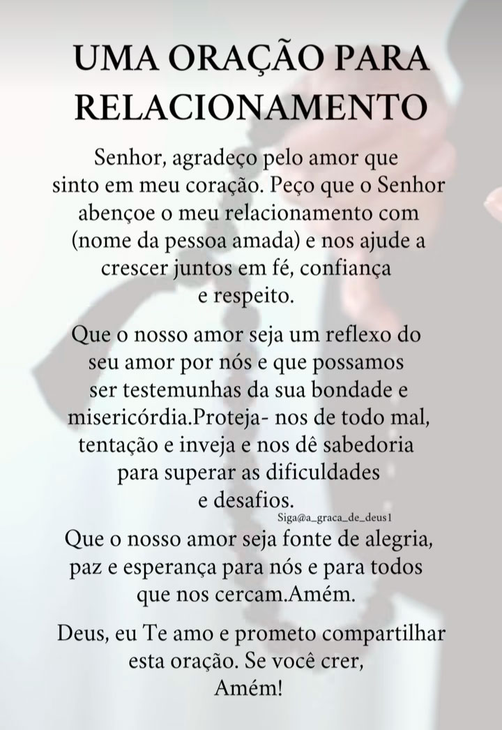 Senhor, agradeço pelo amor que sinto em meu coração. Peço que o Senhor abençoe o meu relacionamento com (nome da pessoa amada) e nos ajude a crescer juntos em fé, confiança e respeito.